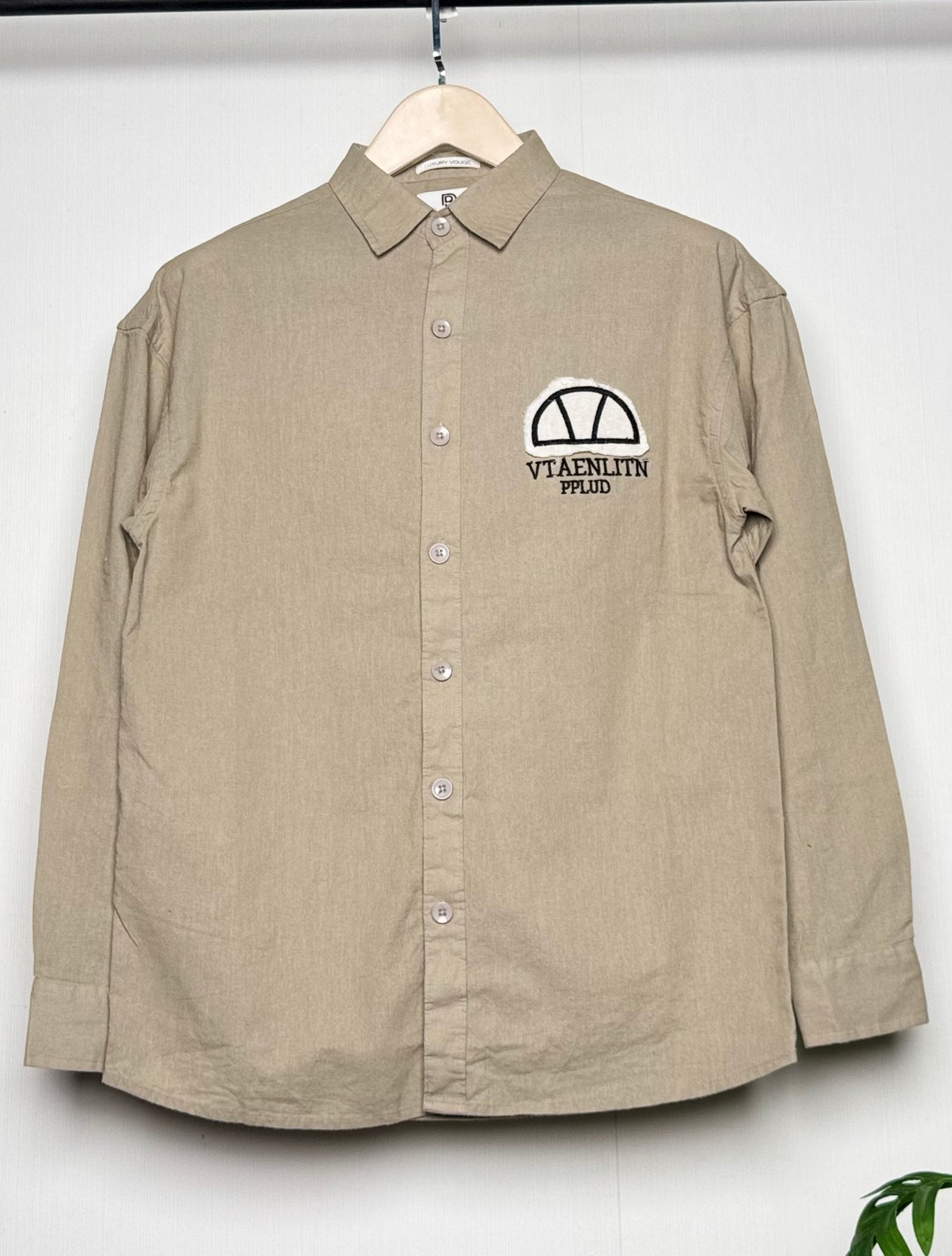 100% Linen Cotton Khaki Embroidery Pattern Relax Fit Shirt
